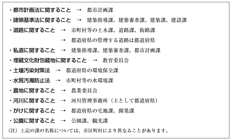 法令上の制限に関する基本的なことを調べるところは、市町村役場等です。しかし、多くの場合、市町村役場等では、多くの法令上の制限を、一つの部課で全部調べることはできず、担当する法令等により窓口が細分化されているのが通常です。市町村等の法令を担当する課を示すと、概ね次のとおりです。